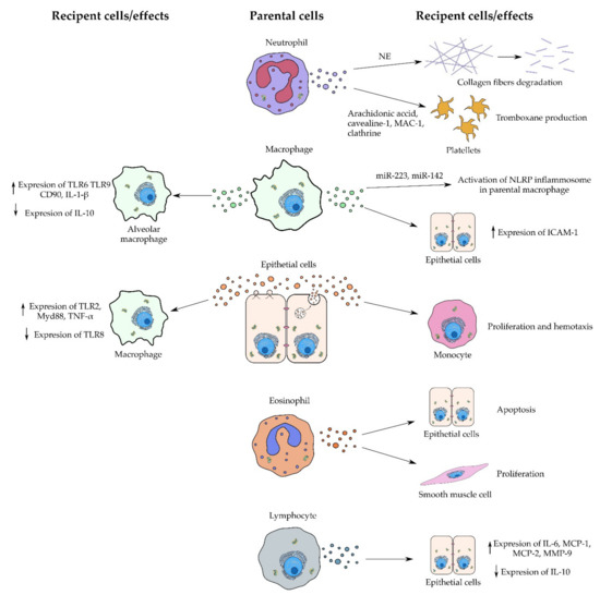 Qiu et al. showed that microparticles (MPs) released by CD4+ and CD8+ T lymphocytes (TLMPs) were highly elevated in COPD patients. Human bronchial epithelial cells (BECs) treated with TLMP-derived MPs from COPD patients demonstrated increased production of IL-6, monocyte chemoattractant protein 1 (MCP-1), MCP-2, metalloproteinase 9 (MMP-9), and TNF-α, as well as a decreased level of IL-10. These results indicate that TLMP-MPs trigger an inflammatory response in epithelial cells during COPD development [37]. Activated neutrophil-derived exosomes play a role in COPD as well, which was revealed by Ganschmer et al. Exosomes derived from activated neutrophils/polymorphonuclear cells (PMN) had a significantly elevated level of surface neutrophil elastase (NE) and exhibited an ability to directly bind and degrade collagen fibrils. The direct connection was mediated by the macrophage-1 (Mac-1) integrin. Moreover, PMN-derived exosomes caused alveolar enlargement in an in vivo model. The results indicate that neutrophil-derived exosomes contribute to emphysema development during COPD by degrading collagen fibrils in the extracellular matrix (ECM) [38]. The importance of neutrophil-derived MVs was confirmed in a clinical study conducted by Soni et al. The concentration of PMN-derived MVs in BALF was significantly higher in COPD patients. Furthermore, the higher concentrations of PMN-derived MVs correlated with the higher severity of COPD. Interestingly, BALF epithelial cell-derived MVs correlated with the number of exacerbations of COPD [39]. Additionally, alveolar macrophages (AM)-derived MVs may also play a role in COPD progression in smoker patients. The level of BALF-MVs derived from macrophages (CD14+) was significantly higher in smokers with COPD than in smokers without COPD and nonsmokers [40].