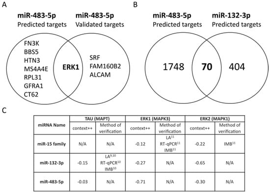 miR-483-5p predicted binding to mRNAs from ERK1 (MAPK3) and ERK2 (MAPK1). (A) Top 8 out of 1818 predicted targets of miR-483-5p from TargetScan 7.2 (based on context++ score) and the overlap with four experimentally-validated targets of miR-483-5p in miRTarBase 7.0. (B) Common targets predicted from TargetScan 7.2 for miR-483-5p and the neuroprotective miR-132-3p. (C) Table of predicted miRNA affinities for TAU (MAPT), ERK1 (MAPK3) and ERK2 (MAPK1) mRNAs in AD literature. LA = Luciferase assay, RT-qPCR = Reverse transcriptase quantitative PCR, IMB = Immunoblotting, N/A = Not available. The superscripted numbers indicate references where these interactions were verified.