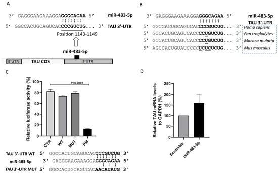 miR-483-5p does not directly bind to TAU mRNA or impact TAU levels. (A) Scheme represents the predicted binding site for miR-483-5p in the 3′-UTR of the TAU mRNA. (B) Prediction indicates human-specific miR-483-5p binding site in 3′-untranslated region (3′-UTR) of the TAU mRNA among different species. (C) Quantitative reporter assay for luciferase activity in HEK293 cells. Reporter constructs carrying a single binding site (CTR, WT, MUT, PM) for miR-483-5p were tested. The miRNA activity on four pmirGLO constructs was measured simultaneously: an empty pmirGLO vector (CTR), a wild-type potential binding site for miR-483-5p (WT), a mutated binding site (MUT), and a site with full complementarity (PM). Interaction scheme of WT and MUT binding site of 3′-UTR of the TAU mRNA with miR-483-5p are shown below. PM (not shown here) is designed to perfectly match the miR-483-5p. Firefly luciferase activity was normalized against renilla luciferase activity. Data are shown as mean ± standard error from four independent experiments. One way ANOVA with post-hoc Tukey HSD was used for statistical analysis. (D) RT-qPCR analysis of TAU mRNA levels upon miR-483-5p mimic transfection in SK-N-MC cells. GAPDH was used as a reference. Data are shown as mean ± standard error from three biological replicates; Unpaired Student’s t-test was used for statistical analysis. In all cases, annotations were made on plots only where significant differences (p < 0.05) were found.