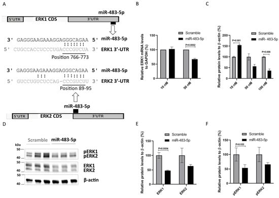 Using TargetScan, we found that the interaction between miR-483-5p and ERK1 3′-UTR (at position 766–773) is a poorly conserved 8mer type site with a context++ score of −0.71 (Figure 3A). According to the miRmine database [29], HEK293 cells do not express miR-483-5p, thus positioning them as a naive cell model for miR-483-5p mimic transfection functional studies. We used scramble as a baseline control for evaluating the effect of miR-483-5p mimic. At 50 nM, miR-483-5p mimic significantly reduced ERK1 mRNA levels in comparison to scramble (Figure 3B). A reduction in ERK1 protein levels was also observed, although only statistically significant in comparison to scramble at 100 nM of miR-483-5p mimic (Figure 3C,D). We also note here that lower concentrations of miR-483-5p show a pronounced increase in ERK1 protein levels. We have observed this behavior in other protein systems with sub-inhibitory concentrations of miRNA; it is yet to be fully understood, however we believe that this may be the result of miR-483-5p interacting with the wider network, cumulatively enhancing ERK1 production without any direct effect. Moreover, TargetScan analysis revealed the interaction between miR-483-5p and the ERK1 homolog ERK2 at the 3′-UTR positions 89–95 to be a 7mer-m8 site type with a context++ score −0.30 (Figure 3A). Using antibodies against total and phosphorylated ERK1/2 proteins in HEK293 cell lysates (Figure 3D–F) we found that miR-483-5p mimic at 100 nM reduced both total and phosphorylated ERK1 and ERK2 protein levels in comparison to scramble control (Figure 3C–F), it was although statistically significant only for ERK1/pERK1. Overall, the results suggest that miR-483-5p inhibits the expression of ERK1, and less extensively ERK2, leading to decreased levels of pERK1/2.