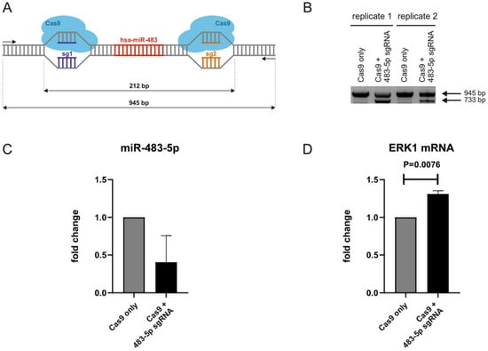 CRISPR/Cas9-mediated knockout of miR-483-5p. (A) Scheme of the CRISPR/Cas9-mediated genomic deletion of miR-483-5p using upstream and downstream sgRNAs (sg1 and sg2). Fragment sizes of the wild-type allele (945 bp) and deleted region (212 bp). (B) Agarose gel electrophoresis of PCR amplified fragments (using primers shown in A) from polyclonal cell populations retrieved upon transfection with empty plasmid without sgRNA (Cas9 only) and Cas9 +/sgRNA expressing plasmid (Cas9 + miR-483-5p sgRNA). 733 bp band corresponds to deleted allele. (C) Fold change decrease in miR-483-5p levels in CRISPR/Cas9-deleted cells (Cas9 + miR-483-5p sgRNAmiR-483 KO). miR-191-5p was used for normalization. (D) Fold change increase in ERK1 mRNA (MAPK3) levels in CRISPR/Cas9-deleted cells. GAPDH was used for normalization. Data represent the mean ± standard deviation from two independent experiments. Statistical analysis was performed using an unpaired Student’s t-test on log 2 (fold change).