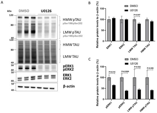 U0126 inhibition of ERK1/2 phosphorylation decreases total and phosphorylated TAU levels in SK-N-MC cells. (A) Representative immunoblots of total and phosphorylated levels of TAU, ERK1 and ERK2 in SK-N-MC cells treated with vehicle (DMSO) or with 10 µM of U0126. β-actin was used as loading control. (B) Quantitative analysis of the immunoblot levels for TAU, ERK1 and ERK2. (C) Quantitative analysis of the immunoblot levels for pTAU, pERK1 and pERK2. Data are shown as mean ± standard error of the mean from three independent experiments; Unpaired Student’s t-test was used to compare groups and statistically significant differences shown with p values.