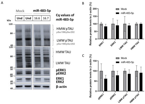 In addition, we transfected SK-N-MC neuronal cells with miR-483-5p (Figure 7A). miR-483-5p mimic at 100 nM, reduced ERK1/2, pERK1/2, LMW TAU, LMW pTAU, HMW TAU and HMW pTAU, although the reductions were not statistically significant in comparison to mock control (Figure 7A–C). Still, the trend in results was similar to that in HEK293 cells (Figure 5A–C). Overall, our results show that miR-483-5p inhibits TAU protein phosphorylation and its expression via repression of pERK1/2 activity.