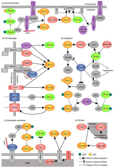 - Mouawad, F.; Tsui, H.; Takano, T. Role of Rho-GTPases and their regulatory proteins in glomerular podocyte function. Can. J. Physiol. Pharmacol. 2013, 91, 773–782. [Google Scholar] [CrossRef] [PubMed]