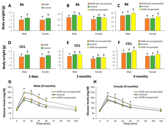 Weights and glucose tolerance of the mice used in this study. Weight at 2 days of age is indicated in B6 (A) and CD1 (D) mice with IUGR and controls of both sexes. Also indicated are weights at 3 months of age of the B6 (B) and CD1 (E) mice, and at 9 months of age of the B6 (C) and CD1 (F) mice. Weights are provided for all animals with IUGR, without IUGR (controls) and those with IUGR that at three months showed a similar weight to controls (IUGR-recuperated). Glucose tolerance test (1.5 g glucose/kg body weight, intraperitoneal) in unrestrained 9-month-old male (G) and female (H) mice after an overnight fast (n = 7 per group). Blood glucose measurements were taken every 15 min for 120 min with a blood glucose monitor (Accu-Chek). Symptoms of metabolic syndrome (glucose intolerance) were observed in IUGR-recuperated mice but not in the IUGR non-recuperated mice. Results provided as the mean ± SD. a,b different letters indicate significant differences (p < 0.05). *, p < 0.05 versus control mice.