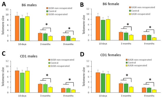 Relative telomere length. Telomere size determined at 10 days, 3- and 9-months of age in mice of strains B6 (A,B) and CD1 (C,D) with IUGR and controls of both sexes. Note that at 3- and 9 months of age, both in male and female mice, the IUGR animals reaching the weight of control animals (IUGR-recuperated) have a shorter telomere length than the other groups. Results provided as the mean ± SD. *, p < 0.05 versus control and IUGR-non recuperated mice.