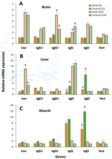 Relative mRNA expression of insulin receptor and insulin-like growth factors and receptors in IUGR B6 female mice. Relative expression levels recorded on Day 2 and Day 10 in the IUGR and control group in brain (A), liver (B), and muscle (C). Data expressed relative to levels recorded for the housekeeping genes Actb and H2afz. Results are provided as the mean ± SD. a,b different letters indicate significant differences between IUGR and control groups on Day 2 or Day 10 of life (p < 0.05).