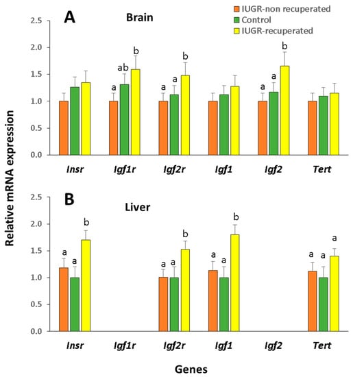 Relative mRNA expression of insulin receptor and insulin-like growth factors and receptors in IUGR B6 female animals. Relative expression levels recorded at 3 months of age in the IUGR-non recuperated, control, and IUGR-recuperated groups in brain (A) and liver (B). Data expressed relative to levels recorded in the housekeeping genes Actb and H2afz. Results are provided as the mean ± SD. a,b different letters indicate significant differences between groups (p < 0.05).
