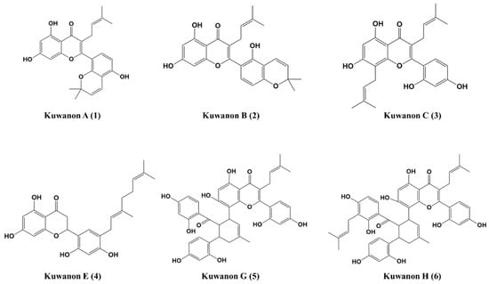 Six natural products were isolated from Mori cortex (roots of Morus alba L.) and identified by comparing HPLC peak profiles (Figure S1) and NMR data (Figures S2 and S3) with literature values: kuwanon A [,], kuwanon B [,], kuwanon C [,,], kuwanon E [], kuwanon G [], and kuwanon H []. The structures of the six compounds are shown in Figure 1.