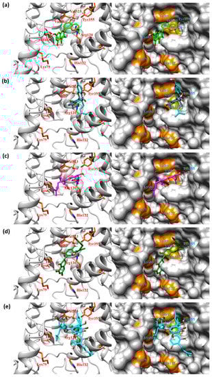 Binding poses with the lowest total interaction energy for (a) kuwanon A, (b) kuwanon B, (c) kuwanon C, (d) kuwanon E, and (e) kuwanon H. All kuwanon derivatives can block the entrance of the celecoxib active site. The orange-colored surface represents the residues at the gate of the cyclooxygenase (COX) activity as calculated with the five lowest pair interaction energies, using pair interaction energy decomposition analysis (PIEDA).