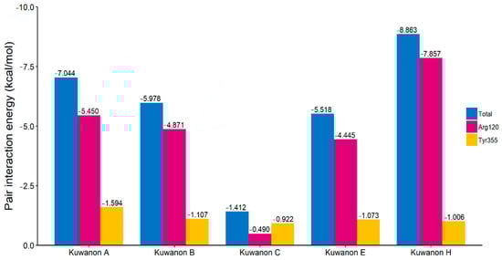 The molecular weights and volumes of the kuwanon derivatives are larger than celecoxib but smaller than chemocoxib A. Since the size of the COX active site is similar to that of celecoxib, kuwanon derivatives could not bind to the COX active site like celecoxib. The residues Arg120 and Tyr355 at the gate of the COX active site are important residues for binding by NSAIDs. When there is no ligand in the COX active site, the gate of the COX active site is in its closed form; however, the gate of the COX active site converts to the open form when arachidonic acid, the COX substrate, approaches the binding site. In a previous study, the conformation change for the gate of the COX active site was determined using molecular dynamics simulation []. This conformational change increases the size of the gate of the COX active site and becomes a structure capable of ligand binding. This conformational change could also be confirmed by superimposing murine and human COX (Figure S4). In addition, Arg120, Tyr355, and Glu524 interact with the ligand through hydrogen bonding, stabilizing it in the active site [,,]. For these reasons, the interaction between Arg120/Tyr355 and the kuwanon derivatives plays an important role in determining their COX-2 inhibitory activity. As a result, both kuwanon A and H showed strong interactions with Arg120 and Tyr355 in the gate of the COX active site (interaction energies of −7.044 kcal/mol and −8.863 kcal/mol, respectively). The Pearson correlation coefficient between IC50 and the summation of pair interaction energies was calculated to be 0.920.