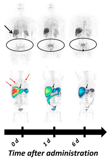 Imaging of HER1 expression in patients using 89Zr-labeled monoclonal antibodies cetuximab (upper row) [75] and panitumumab (bottom row) [81]. Photopenic lesions in liver are indicated with black arrows; accumulation in lungs pointed with red arrows, resolved with time. These images were originally published in Oncotarget [75] and Am J Nucl Med Mol Imaging [81].