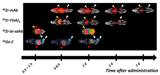 Imaging of HER1 expression (white arrows) in xenografted mice using 89Zr-labeled monoclonal antibody (cetuximab [87]), F(ab′)2-fragement (cetuximab-F(ab′)2 [87]), biparatopic dimer of single domain antibodies (sdAb) [135], and 66Ga-labeled affibody molecule (Z2377 [138]). Yellow arrows point to the uptake in liver and red arrows in kidneys. These images were originally published in J Nucl Med [87] © SNMMI; Sci Rep [135] and Pharmaceutics [138].