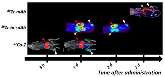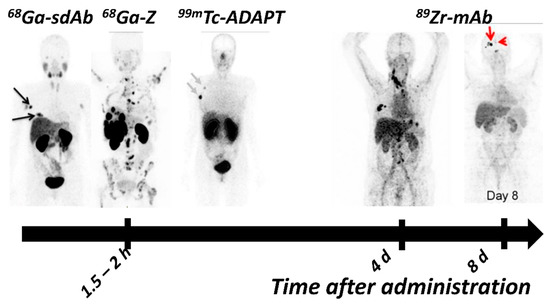 Blood clearance of ZEGFR:2377 is slower than the clearance of affibody molecules binding to other molecular targets [120,140,142]. This, most likely, could be attributed to the substantial uptake of HER1-binding affibody molecules in the liver due to the natural receptors’ expression and slow internalization of ZEGFR:2377 [120]. ZEGFR:2377 is cross-reactive to murine ErbB1, which is a definite advantage as this allows for more accurate estimation of accumulation in non-tumor tissues. Clearance of radiolabeled ZEGFR:2377 from blood shifts the equilibrium for hepatocyte-bound tracers to dissociation, causing the release of bound [89Zr]Zr-DFO-ZEGFR:2377 back into the blood stream. Regardless, [89Zr]Zr-DFO-ZEGFR:2377 provided higher tumor-to-tissue contrast at both 3 h and 24 h pi than [89Zr]Zr-DFO-cetuximab at 48 h pi [140]. Figure 2 illustrates the imaging contrast of HER1-targeting affibody molecules at different time points, in comparison with antibodies, antibody fragments and sdAb.