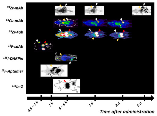 Imaging of HER2 expression (white arrows) in xenografted mice using monoclonal antibodies ([89Zr]Zr-trastuzumab [84] and [64Cu]Cu-pertuzumab [194]), [89Zr]Zr-Fab (PASylated fragments of trastuzumab [207], 18F-labeled sdAb [217], 125I-labeled DARPin (G3 [224], 18F-labeled aptamer [225], and 111In-labeled affibody molecule (ABY-025 [226], abbreviated 111In-Z). Yellow arrows point to uptake in the liver and red arrows in the kidneys. These images were originally published in JNM [84,207,217,226] © SNMMI, Int J Mol Sci [224], and PLoS One [225].