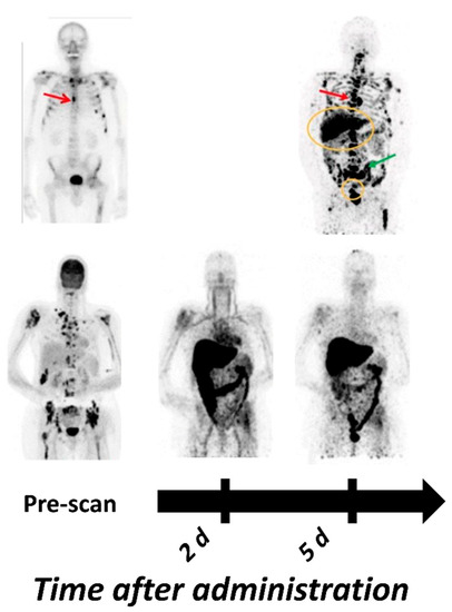 Similar to cetuximab, the antibody panitumumab has a sub-nanomolar affinity towards HER1. Direct comparison of 86Y-labeled CHX-A”-DTPA-cetuximab and [86Y]Y-CHX-A”-DTPA-panitumumab in a malignant mesothelioma model suggested the superiority of [86Y]Y-CHX-A”-DTPA-panitumumab for PET-imaging of HER1 expression due to a slightly higher tumor uptake and significantly lower liver uptake [117,118]. Lindenberg et al. in 2017 reported the first human experience of [89Zr]Zr-panitumumab imaging in three patients with metastatic colorectal cancer, showing the safety of the tracer (Figure 1) [81]. However, no tumors could be visualized, which might be due to their location in the liver and abdomen, areas with high metabolic accumulation of [89Zr]Zr-panitumumab. In addition, n o unlabeled compound was co-injected to potentially reduce HER1-mediated hepatic uptake. So-called “cold loading”, meaning the spiking of the injection mixture with a non-labeled protein to saturate HER1 receptors in the liver and increase the concentration of the radiolabeled imaging agent in the blood circulation, has been shown to be a feasible approach in clinical and preclinical studies [119,120]. Currently, two clinical trials with [89Zr]Zr-panitumumab are ongoing (clinical trials.gov, NCT03764137, NCT03733210).