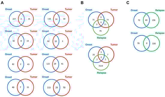 Venn diagrams of somatic single nucleotide variants (SNVs) shared by exo-DNA and tumor DNA. (A) SNVs in common between exo-DNA at onset and the corresponding tumor DNA. (B) SNVs in common among exo-DNA at onset, exo-DNA at relapse, and the corresponding tumor DNA. (C) SNVs in common between exo-DNA at onset and exo-DNA at relapse.