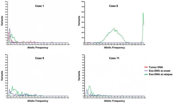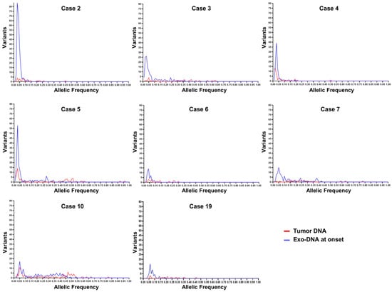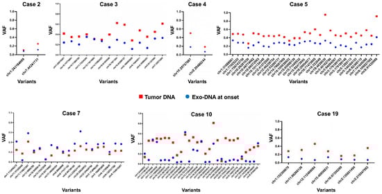 To investigate if the dsDNA extracted from NB cell-derived exosomes reflected the mutational status of their parental tumor cells, we performed further analysis on the somatic SNVs found in common between different DNA specimens of the same case, evaluating their allelic frequency. Considering the NB cases with available tumor DNA and exo-DNA at onset, we observed that SNVs frequency in the exo-DNA at onset was generally lower than in tumor DNA, probably indicating less tumor content in exo-DNA (Figure 6).