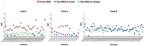 Frequency of the somatic SNVs in common between exo-DNA at relapse and tumor DNA/exo-DNA at onset. (VAF = variant allele frequency).