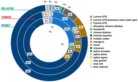 Most importantly, it was possible to genotype the whole exome through the analysis of exo-DNA (the median genotypability value (%PASS) obtained on the entire target region (design) was 97.8) (Supplementary Table S1). In particular, the integration of unique molecular identifiers (UMIs) in the sample preparation, as described in Section 4, allowed a more accurate identification of PCR duplicated fragments. Moreover, the removal of fragments deriving from repetitive regions of the genome using the UMI’s bioinformatics pipeline increased the genotypability along all the target regions. These results showed higher genotypability of the exome (more than 1%) respect to previously reported WES analyses on genomic DNA, with a sequenced fragment length of 350 bp [27]. To be noticed, the exosomes genotype was higher (more than 2%) than in exomes, with even shorter fragment sizes (200 bp) and read length (75 bp) [27]. Given the large size of the entire target region, the genotypability for each chromosome in the different DNA specimens was investigated, looking for genotypability differences. No substantial differences emerged among chromosomes within the same DNA specimen, confirming a high genotypability distributed along the entire exome. The median of the samples for each tumor DNA, exo-DNA at onset, exo-DNA at relapse is reported in Table 2.
