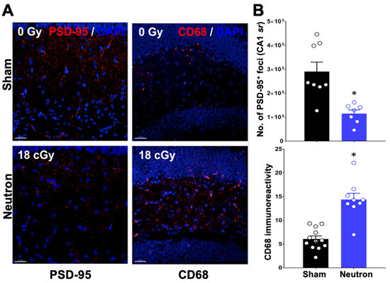 We further explored the synaptic integrity of the hippocampal CA1 stratum radiatum by quantitatively assessing the number of PSD-95 and CD68 expression (Figure 2). Post-synaptic density protein 95 (PSD-95) is an excitatory-associated synaptic protein involved in plasticity, the level of which can be influenced by radiation exposure [11,28]. As PSD-95 is responsible for recruiting receptors and other proteins to the synaptic cleft, changes in expression level of PSD-95 may disrupt neurotransmission in a manner that could contribute to cognitive dysfunction. For that reason, we evaluated PSD-95 protein levels in the dentate gyrus (DG) region of the HPC (Figure 2A). Representative images clearly show neutron-induced decreases in PSD-95 staining 3.5 months after the end of neutron irradiation (Figure 2A). Quantitative analysis of the number of foci indicated a significant decrease in the DG region of the neutron-irradiated brain (Figure 2B; * p < 0.05).