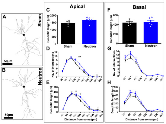 Apical neuronal complexity altered in response to chronic low-dose irradiation. Representative cell tracings from sham (A) and neutron (B) exposed mice. Scale bar = 50 mm. (C) Analysis of apical dendritic length. (D,E) Sholl analyses of apical dendrites. (F) Analysis of basal dendritic length. (G,H) Sholl analyses of basal dendrites. * p < 0.05; ** p < 0.01. Data represents mean ± SEM.