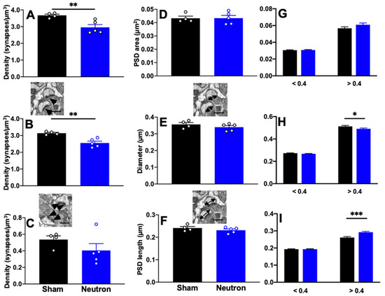 Having found that neutron irradiation affects the complexity of apical dendrites of CA1 neurons at 150–180 mm from the soma, we subsequently examined synapse density morphology in the stratum radiatum, at the ultrastructural level using quantitative EM. Analysis of total synapse density did revealed significant decrease in synapse density between irradiated mice and controls (t(7) = 3.610; ** p = 0.009; Figure 4A). When we looked at the densities of non-perforated and perforated synapses we found that irradiated mice had significantly fewer non-perforated synapses compared to controls (t(7) = 4.457; *** p = 0.003). There was no difference in the density of perforated synapses (Figure 4B,C). To address whether neutron irradiation alters ultrastructural aspects of stratum radiatum synaptic morphology, we measured maximum head diameter, maximum PSD length and PSD area. We found no significant differences in mean PSD area, mead PSD length and mean head diameter (Figure 4D–F). Our previous studies have classified mouse CA1 spines with head diameters < 0.4 μm as thin spines and > 0.4 μm as mushroom spines [30,31,32,33,34]. When we apply this parameter to nonperforated synapses we found that size of the larger, >0.4 μm spines in neutron irradiated mice are smaller than in control mice suggesting that there may be fewer mushroom spines in irradiated mice compared to controls (Figure 4H, t(285) = 2.061; * p = 0.04). Interestingly, larger nonperforated synapses from Neutron irradiated mice had significantly larger PSD lengths than sham mice, which may be some form of compensation for the loss of spines (Figure 4I; t(404) = 3.725; *** p = 0.0002). There was no difference in perforated synapses (data not shown).