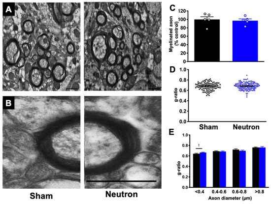 Chronic low dose neutron irradiation does not affect myelination. (A) Representative myelin images from sham and neutron treated mice. Scale bar = 800 nm. (B) Electron micrograph depicting a single axon of similar diameter in sham mice (left) and neutron irradiated mice (right). Scale bar = 400 nm. (C) There was no significant difference in the percentage of myelinated axons between neutron irradiated mice and sham. Data represents group means ± SEM. There is no difference in overall g-ratios in neutron irradiated mice compared to shams (D) and when binned according to axon diameter (E). There was an increase in g-ratio in axons with diameters < 0.4 um in irradiated mice, but it did not reach significance. Unpaired t-test; p = 0.058. Data represents individual measurements ± SEM.
