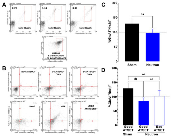 Fluorescence single synaptosome long-term potentiation (FASS-LTP) in chronic low-dose neutron irradiated rats. In order to estimate the functional status of the glutamate neurotransmission, hippocampal crude synaptosomal fractions were obtained from rats that were exposed chronic low dose neutron irradiation (black bars) and compared with age-matched sham controls (blue bars). (A) Representative forward scatter (FSC-HLog, x-axis) vs. side scatter (SSC-HLog, y-axis) dot plot showing the size–complexity profile of gated particles (inside R1 rectangle, size-gated synaptosomes). FSC–SSC dot plots using 0.79, 1.34 & 3.39 μm calibrated beads. (B) Representative plots showing the profile of scatter under different conditions. The numbers used in the estimation of cLTP are the upper right (UR) quadrant, which is showing (in%), the number of closely associated GluA1+Nrx1β+ particles gated to the synaptosomal size in that quadrant. Along the y-axis is the far-red fluorescence while along the x-axis is the green fluorescence that are couple to GluA1 and Nrx1β, respectively. The lower left quadrant represents the particles that do not show any appreciable association between the two proteins, while the lower right shows the particles scattered by Nrx1β and the upper left shows GluA1. Appreciable numbers of GluA1+Nrx1β+ scatter in the UR quadrant is only seen in the panel labeled “cLTP (chemically induced LTP)”. The panels that contain either no antibody or any one of the antibodies or extracellular buffer (basal) do not show a significant increase. The use of AP5, the NMDA antagonist, prevents the cLTP and is an effective negative control used in validating the response. (C) Potentiation levels in sham animals as a function of the basal response is shown in black bars (129.4 ± 19.18, n = 10) while the irradiated group is shown in blue bars (97.86 ± 13.87, n = 21); there is no significant difference between the two (p = 0.1917, unpaired t-test) (D) Upon separation of the irradiated groups into good performers vs. bad performers in the ATSET behavioral paradigm, the good performers (filled blue bars, 86.24 ± 13.45, n = 7) show a significant difference (* p = 0.044) compared to the sham, but the bad performers (clear blue bars, 102.7 ± 19.88, n = 14) do not show any significant difference to either groups.