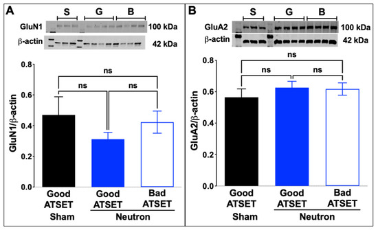 Western blot analyses for the ionotropic glutamate receptors in the sham and the low dose neutron irradiated groups of rats. (A) No significant differences were appreciated in the GluN1 subunit of the NMDA receptor between the three groups of rats (B) No significant change was observed in the expression levels of the GluA2 subunit of the AMPAR between the three groups of rats. Crude synaptosomal fractions from three-four animals per group were used in the assessment and statistical significance (p < 0.05) was determined using non-parametric, Kruskal–Wallis t-test.