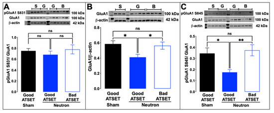 Phosphorylation of serine at position 845 of the GluA1 subunit is significantly decreased in good ATSET rats. (A) The phosphorylation state of the serine residue at position 831 was not altered, but (C) at position 845, the good ATSET group showed lower phosphorylation of serine compared to the other two groups. (B) Interestingly, significantly lower expression of GluA1 subunit of the AMPA receptors was noted in the good ATSET neutron rats compared to the other two groups. Crude synaptosomal fractions from three-four animals per group were used in the assessment and statistical significance (* p < 0.05, ** p < 0.01) was determined using non-parametric, Kruskal–Wallis t-test.