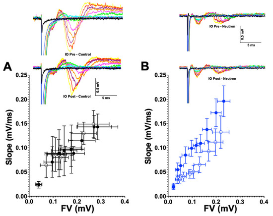 Input-output curves are not altered between the control and the chronic low dose neutron-irradiated group. (A) Pre-(filled circles) and post-LFS input-output relationships (clear circles) for the control group are plotted as a function of slope (mV/ms) on the y-axis and the fiber volley (mV) along the X-axis to estimate whether there are changes in the synaptic strength of the response, which would be observed in the either the leftward or rightward shift of the post curves. Representative curves are provided adjacently, where increasing stimulation currents are plotted in different colors. (B) Pre (filled blue circles) and post-LFS (clear blue circles) input-output relationship for the neutron irradiated group do not show significant differences. Representative curves are presented alongside, similar to the control group.
