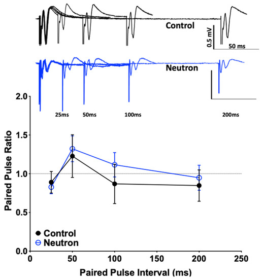 Paired pulse ratio is not significantly different between the control and the chronic low dose neutron-irradiated group. Representative traces for the control (black) and the neutron irradiated group (blue) are provided. There is no significant difference in the paired pulse ratio (calculated as the fEPSP slope of second pulse over the first) at four different intervals tested (25, 50, 100 and 200 ms), suggesting that there is no presynaptic deficit that accounts for the effects of the irradiation associates synaptic or behavioral changes.