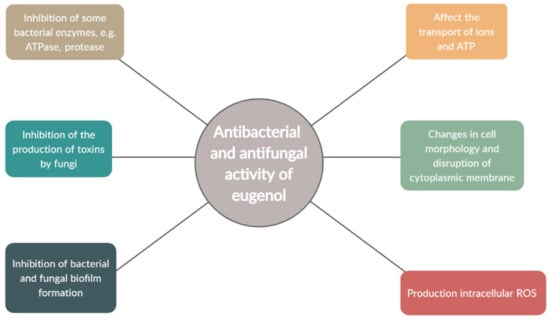 In addition to its significant antibacterial properties, eugenol has also demonstrated antiviral activity; it acts synergistically with acyclovir in inhibiting the herpes virus in vitro and against HSV-1 and HSV-2 (Herpes simplex virus 1/2) by preventing viral replication and limiting viral infection. Eugenol has also been found to possess antifungal activity against a range of fungal strains in vitro, including Candida albicans, Aspergillus niger, Penicillum glabrum, Penicillum italicum, Fusaria oxysporum, Saccharomyces cerevisiae, Trichophyton mentagrophytes, Lenzites betulina, Laetiporus sulphurous, and Trichophyton rubrum. In the case of fungi, it is thought that eugenol disturbs cell membrane function, inhibits virulence factors, and prevents fungal biofilm formation [,,]. The effect of eugenol against bacteria and fungi is shown in Figure 2.