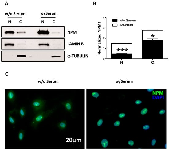 (A–C). Western Blotting analysis of cytoplasm and nuclear fraction of nucleophosmin (NPM) in human vein endothelial cells (HUVEC) after serum starvation. (A) Representative blot displaying the shuttle of NPM. Lamin B and α-tubulin have been employed as nuclear and cytoplasmic protein, respectively. (B) The densitometry analysis shows that NPM translocates from nucleus to the cytoplasm after serum deprivation (w/o Serum) but not in the presence of serum (w/Serum). Data are the results of 3 independent experiments. * p < 0.05, *** p < 0.001. (C) Immunofluorescent staining of HUVEC confirming a delocalized NPM in the cytoplasm in the absence of serum (w/o Serum) but not in presence of serum (w/Serum). NPM and DAPI stain green and blue, respectively. Scale bar is displayed.