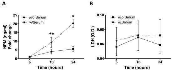 Based on this observation, we further investigated whether the cytoplasmic translocation of NPM could also involve its release in the extracellular microenvironment. To this aim, after serum deprivation HUVEC-derived conditioned media were collected according to a defined time course (6, 18, and 24 h) and the amount of NPM was quantified by ELISA. We found that soluble levels of NPM progressively tended to increase over the time peaking at 24 h of stress condition (Figure 2A, p < 0.01 and p < 0.05, 18 and 24 h vs. 6 h, respectively). As the release of NPM by necrotic cells has been described [], in order to rule out potential passively necrosis-related secretion of NPM, we also measured the release of the enzyme lactate dehydrogenase (LDH), a marker of membrane integrity. Importantly, no significant changes of LDH levels were detected in the supernatants of HUVEC, as cells expanded under serum deprivation and standard conditions with serum showed a comparable profile at all time points (Figure 2B, all p > 0.05).