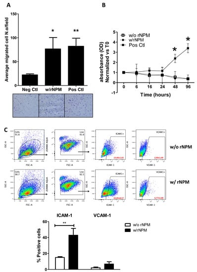 Considering that the endogenous NPM was secreted by HUVEC, we aimed to explore its paracrine properties on endothelial cells. Specifically, we assessed both migrative and proliferative ability of HUVEC after stimulation with exogenous recombinant NPM (rNPM 200 ng/mL, which was assessed by a curve dose–response) and also suggested by the FACS Analysis showing 200 ng/mL rNPM as the best physiological concentration). Results showed that rNPM significantly increased the chemotactic property of HUVEC compared to the negative control (EBM-2TM), Figure 3A, p < 0.05). The enhancement of cell migration was not caused by a proliferative effect. In fact, the exogenous stimulation of HUVEC with rNPM did not induce cell proliferation up to 96 h compared to the negative control (Figure 3B, p > 0.05). Additionally, the potential modulation of inflammatory markers expressed on endothelial cells and induced by rNPM was investigated. To this aim, HUVEC were treated with rNPM (200 ng/mL) for 24 h and analyzed by FACS for the expression of CD54 (ICAM-1) and CD106 (VCAM-1), the constitutive and activated main markers involved in the inflammatory modulation []. Interestingly, the percentage of positive endothelial cells to ICAM-1 but not to VCAM-1 significantly increased after treatment with rNPM (Figure 3C, p < 0.01).