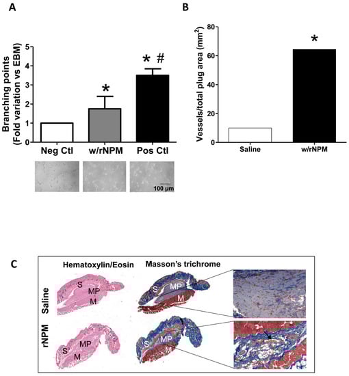 Next, to assess whether rNPM was able to modulate endothelial cell function by exerting potential angiogenic activity, we performed an in vitro Matrigel assay. The 10% FBS condition was used as the positive control []. Results showed that rNPM induced a significant increase of the number of branching points compared to the negative control (Figure 4A, p < 0.05). More importantly, this result was confirmed by in vivo experiments where Matrigel supplemented with 200 ng/mL rNPM was injected subcutaneously into the mid-lower abdominal region of mice, in order to foster the migration of host endothelial toward the formation of vascular networks in the Matrigel plugs. After 8 days the residual plugs were evaluated by H&E and Masson’s trichrome staining, by quantifying the newly formed functional vessels in the plug, identified by the presence of erythrocytes within [,]. Results confirmed a significant increase of the number of in vivo functional vessels after injection of rNPM compared to saline (Figure 4B,C, p < 0.001).