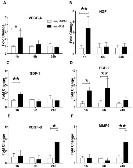 (A–F). Gene expression regulation of angiogenic genes. (A) The graph shows the upregulation of mRNA levels of: (A) VEGF-A, (B) HGF, (C) SDF-1, (D) FGF-2, (E) PDGF-B, (F) MMP9 after 1, 6, or 24 h of stimulation with rNPM (200 ng/mL, w/rNPM) compared to the untreated control (w/o rNPM). Data are the results of 3 independent experiments (technical triplicates). * p < 0.05, ** p < 0.01).