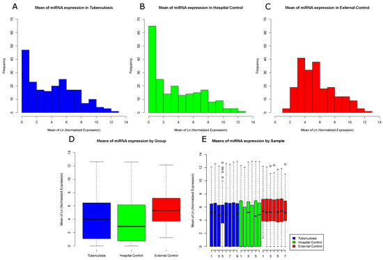 Frequency distribution of miRNA reads among sample groups: (A) log-normalized miRNA mean frequency distribution in Tuberculosis samples; (B) log-normalized miRNA mean frequency distribution in Hospital Control samples; (C) log-normalized miRNA mean frequency distribution in External Control samples; (D) log-normalized miRNA mean expression by groups; and (E) log-normalized miRNA mean expression by sample. One sample from the Tuberculosis patients group was filtered and removed due to low sequence quality.