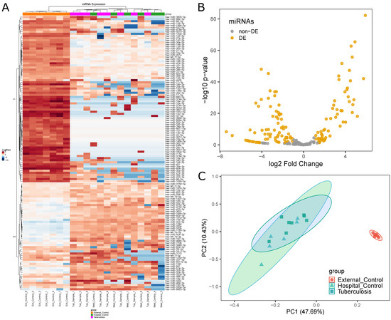 DEmiRNAs data obtained from edgeR showed differences in miRNA expression levels between the three initial groups (Figure 2A). This analysis is based on Kendall’s hierarchical clustering correlation of miRNA expression profiles in all samples and identified a clear distinction between External Control and Medical Samples groups. This contrast is presented in two clusters of DEmiRNAs. In the first cluster, the External Control group presented higher expression levels, while, in the second, External Controls presented lower expression levels. However, this comparison could not distinguish Tuberculosis patients from Hospital Controls.