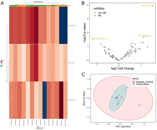 Differential miRNA expression profiles between Tuberculosis patients and Hospital Control samples: (A) difference in expression levels of miRNAs between the two groups (HC, orange; TP, green) indicated by a heatmap; (B) volcano plot highlighting three miRNAs with differential expression; and (C) PCA plot highlighting the homogeneity and separation of the groups based on miRNA expression.