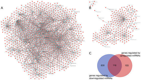 miRNA–gene networks for MS vs. EC generated by ncRNA-network tool: (A) graphical representation of the miRNA–gene network of downregulated miRNAs in MS vs. EC; (B) graphical representation of the miRNA–gene network of downregulated miRNAs in MS vs. EC; and (C) Venn diagram of genes regulated by downregulated miRNAs and upregulated miRNAs.