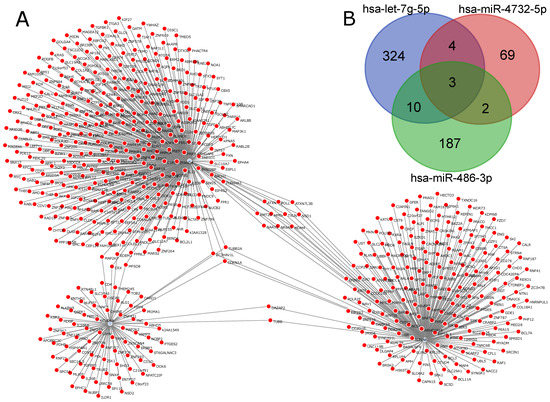 miRNA–gene network for TP vs. HC generated by ncRNA-network tool: (A) miRNA–gene network for the three DEmiRNAs (hsa-miR-4732-5p, hsa-miR-486-3p and hsa-let-7g-5p); and (B) Venn diagram indicating intersections between genes for each miRNA.