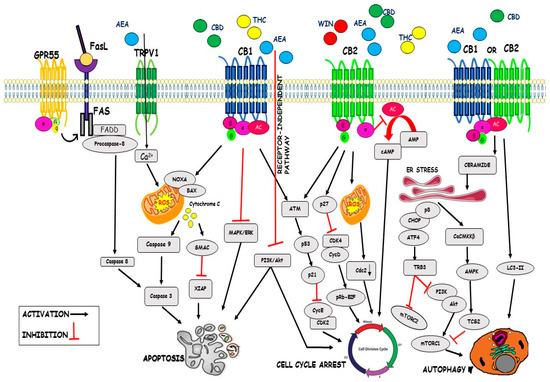 Main anticancer molecular pathways mediated by cannabinoids. Cannabinoids inhibit cell cycle progression (↓cyclin-CDK complexes, ↓cAMP, ↑ROS↓, PI3K/Akt), can induce apoptosis (ROS↑, caspase8-9↑, MAPK/ERK↓, PI3K/Akt↓) and autophagy (Ceramide↑, ER STRESS↑, mTORC1/2↓, LC3-II↑) by activation of cannabinoid receptors CB1 or CB2, but can be also induced by mechanisms independent of CB1 and CB2 receptors.