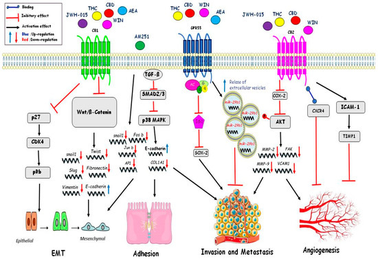 Cannabinoids’ effects on signaling pathway of EMT, adhesion, invasion, metastasis, and angiogenesis.
