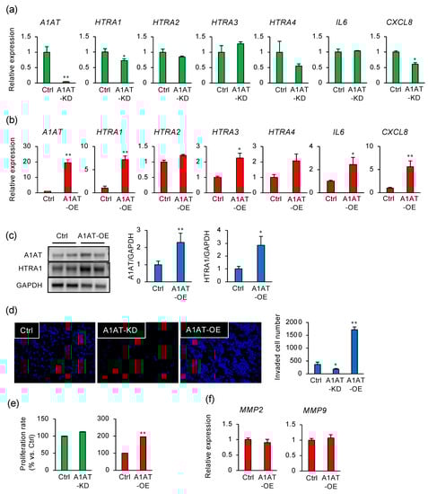 In human placental tissue, A1AT may interact directly with HTRA1 [,] and suppress the inflammatory response [,]. The effect of A1AT knockdown (KD) or overexpression (OE) on the expression of HTRAs and the pro-inflammatory genes IL6 and CXCL8 was determined in HTR8/SVneo cells (Figure 1a,b). A1AT-KD reduced the expression of HTRA1, CXCL8, and A1AT (Figure 1a), whereas A1AT-OE increased the expression of HTRA1, HTRA3, HTRA4, IL6, and CXCL8 in the trophoblast cells (Figure 1b). Furthermore, A1AT-OE increased the amount of the HTRA1 protein (Figure 1c). As HTRA1 regulates the invasion of trophoblast cells [], we evaluated the effect of A1AT on that invasion. A1AT-KD reduced the number of invading cells, whereas A1AT-OE increased the number (Figure 1d). In addition, A1AT-OE trophoblasts exhibited an approximately two-fold higher rate of proliferation (Figure 1e), but A1AT-OE did not affect the expression of the trophoblast invasion markers MMP2 and MMP9 (Figure 1f).
