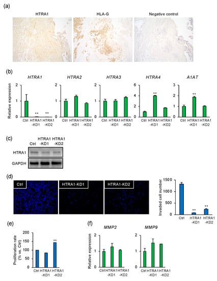 To characterize the expression of HTRA1 in the placenta, term placental tissue was immunostained for HTRA1 and HLA-G, a marker of the extravillous trophoblast. HTRA1 was localized in the extravillous trophoblast, syncytiotrophoblast, and endometrial decidual cells (Figure 2a). To ascertain whether HTRA1 regulates invasion by extravillous trophoblast cells, the effects of the knockdown of HTRA1 were determined using two siRNAs (HTRA1-KD1 and -KD2) that specifically recognize HTRA1 mRNA sequences in different regions. The HTRA1 siRNAs reduced HTRA1 mRNA and protein expression but did not change the expression of HTRA paralogs (Figure 2b,c). Both HTRA1 siRNAs markedly inhibited cell invasion (Figure 2d). A slight increase in cell proliferation was observed in cells that had been transfected with HTRA1-KD2 (Figure 2e), but there was no effect on the expression of MMP2 or MMP9 (Figure 2f).