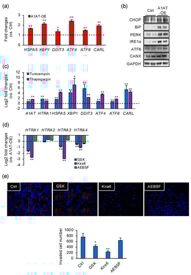 A1AT-induced HTRA1 expression and cell invasion are regulated by unfolded protein response (UPR) signaling. (a) The mRNA expression of endoplasmic reticulum (ER) stress markers in HTR8/SVneo cells that had been transfected with A1AT-OE was measured. GAPDH was used as the reference gene. The values are the means ± SEMs of three independent experiments. * p < 0.05, ** p < 0.01. (b) The protein levels of ER stress markers were measured by immunoblotting lysates from A1AT-OE HTR8/SVneo cells. GAPDH served as a loading control. (c) HTR8/SVneo cells were treated with tunicamycin (5 μM) or thapsigargin (100 nM) for 48 h, and then the mRNA expression of A1AT, HTRA1, and ER stress markers was measured using qPCR. GAPDH was used as the reference gene. The values are the means ± SEMs of three independent experiments. * p < 0.05, ** p < 0.01. (d) A1AT-OE HTR8/SVneo cells were treated with GSK2606414 (GSK, 250 nM), Kira6 (1 μM), or AEBSF (300 μM) for 24 h, and then the mRNA expression of HTRAs was measured. GAPDH was used as the reference gene. The values are the means ± SEMs of three independent experiments. ** p < 0.01. (e) A1AT-OE HTR8/SVneo cells were treated with GSK2606414 (GSK, 250 nM), Kira6 (1 μM), or AEBSF (300 μM) in Matrigel-coated transwells for 24 h. Representative images of the cells that passed through the transmembranes are shown in the panels on the left. The numbers of cells that passed through the transmembranes were counted and are presented as the means ± SEMs of three independent experiments. * p < 0.05, ** p < 0.01.