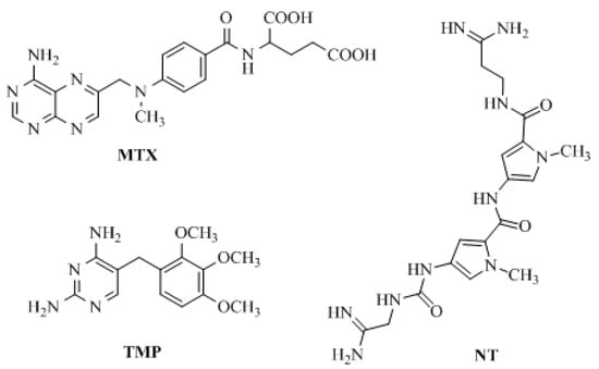 Structure of methotrexate (MTX), trimethoprim (TMP), and netropsin (NT) as model compounds.